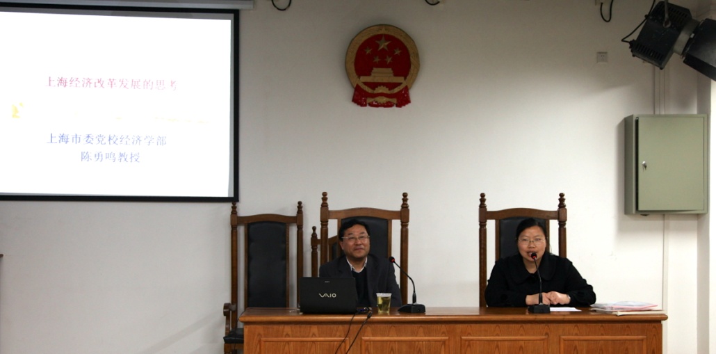 报告中,陈勇鸣教授充分运用数据、图表等翔实资料,对上海经济改革发展的多个领域做了深入的理论分析和详细的数据论证,让教师们受益匪浅。陈勇鸣认为,上海面临着特大城市的空间承载力、特大工业城市的转型、港口城市的交通压力、贸易依存度过高的国际市场压力、财政支出的压力、民生与历史负担问题、科技成果转化问题、民营经济发展相对缓慢等8大问题,经济改革发展时间紧迫、任务繁重,必须抓住和利用好发展的重要战略机遇,从自贸区建设、深入推进国资国企改革、加快政府自身改革、城乡一体化融合发展、文化体制改革等五个方面重点推进改革发展落到实处。