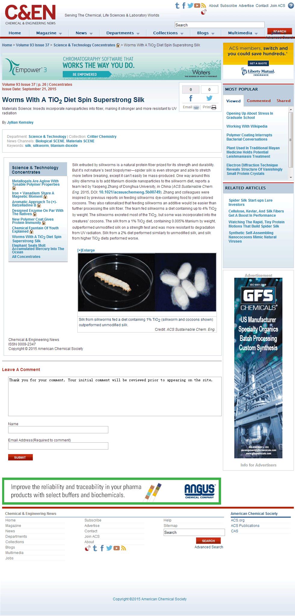 9月21日,美国《化学化工新闻》(Chemical & Engineering News)以“Worms With A TiO2 Diet Spin Superstrong Silk”为题报道了该项目(第39卷37期,26页,新闻链接:http://cen.acs.org/articles/93/i37/Worms-TiO2-Diet-Spin-Superstrong.html)。创刊于1923年的《化学化工新闻》是世界化学与化工领域重要的新闻杂志,主要报道该领域最新的重大成果、学术热点和前沿问题。