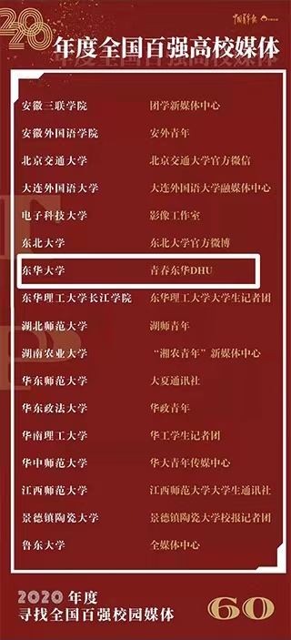 我校团委官方微信公众号“青春东华DHU”荣获“2020年度全国高校百强媒体”称号