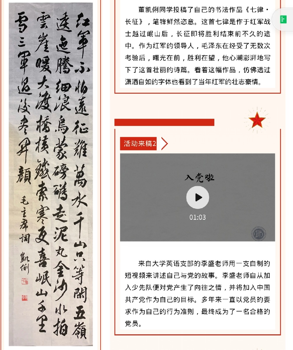 “激昂发声,唱响党史学习主旋律”。外语学院党委坚持紧扣“为什么学习党史”“学什么党史”“怎样学习党史”三大问题,充分利用新媒体平台,打造极具专业特色的虚实结合的党史学习平台,面向全院师生开展红色征集令——我与党的故事,使党史文化理论更具有吸引力,促进党史文化真正实现“入脑、入心”,坚持做好学院师生党史学习教育的“传声筒”;依托“东华外院新闻站”公共号开辟党史学习微专栏,易班平台开展“党史故事我来讲”等丰富多彩的活动平台,坚持党史学习教育的引领地位,以此发挥出党史学习教育的强大育人功能;通过利用互联网创设教学情境,打造“互动式+体验式”党史学习新课堂,将党史融入学院全员、全程、全方位育人大格局,打通党史学习教育“最后一公里”,将党史的滋养转化为全院师生的政治本色,奋斗的行动动力。