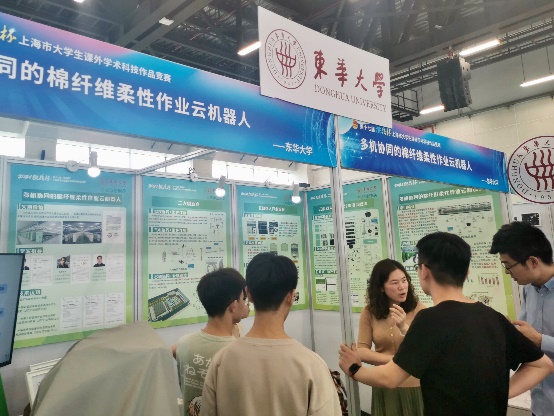 机械学院的“多机协同的棉纤维柔性作业云机器人”项目获得上海市一等奖。团队针对智能工厂机器人协同柔性作业的难题,提出了多合一柔性作业末端执行器、气电协同控制算法、云端调度系统,实现了高质高效协同作业。为智能工厂提供了一种多机协同的“云-边”互动解决方案,助力中国智造。