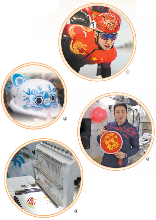 图①为短道速滑运动员武大靖比赛时身着国潮服饰;图②为2022年北京冬奥会开幕式各代表团引导员佩戴的虎头帽;图③为神舟十三号航天员叶光富在遥远的太空发来视频,向祖国和人民送上新春祝福(视频截图);图④为2021中国南通国际高端纺织产业博览会上展示的自动刺绣机器。 资料图片 制图:赵偲汝  |