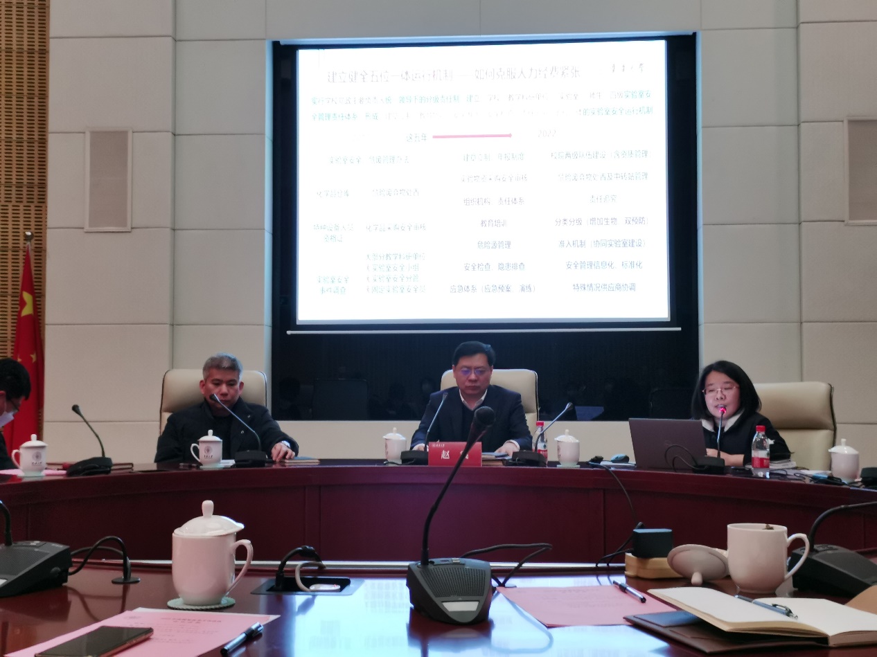 赵震强调,要牢固树立安全发展理念,紧抓实验室安全工作不放松,从四个方面做好2023年学校实验室安全管理工作:一是要提高政治站位,深入学习贯彻落实习近平总书记关于安全生产的重要指示批示精神,对照教育部《高等学校实验室安全规范》,切实落实安全责任体系、常态化管理制度和应急处置机制;二是要强化制度执行,统筹管理实验室安全工作,把实验室安全工作纳入本单位事业发展规划,把各项制度落实到具体岗位、具体工作、具体人员中;三是要加强教育培训,按照“全员、全面、全程”的要求,结合自身实际情况和学科专业特点,有针对性的建立实验室安全教育培训与准入制度;四是要重视隐患治理,实行隐患排查、登记、报告、整改、复查的“闭环管理”,将风险控制在隐患形成前、把隐患消灭在事故发生前,坚决防范遏制安全事故发生。